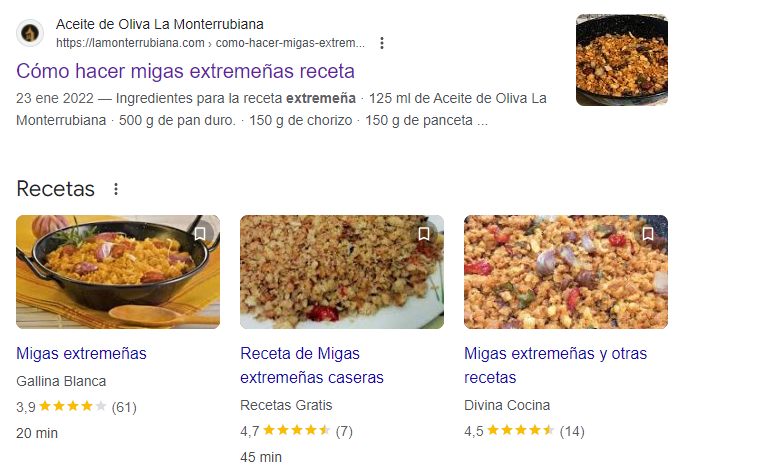 De esta forma Google (o cualquier otro buscador) puede recoger toda la información de tu web y entender que «20 min» hace referencia al tiempo de preparación, que «125 ml de Aceite de Oliva La Monterrubiana, 500 g de pan duro, 150 g de chorizo, etc…» hacen referencia a los ingredientes, y así montar en la SERP los Rich Snippets (resultados enriquecidos) para hacer los resultados más útiles a los usuarios.