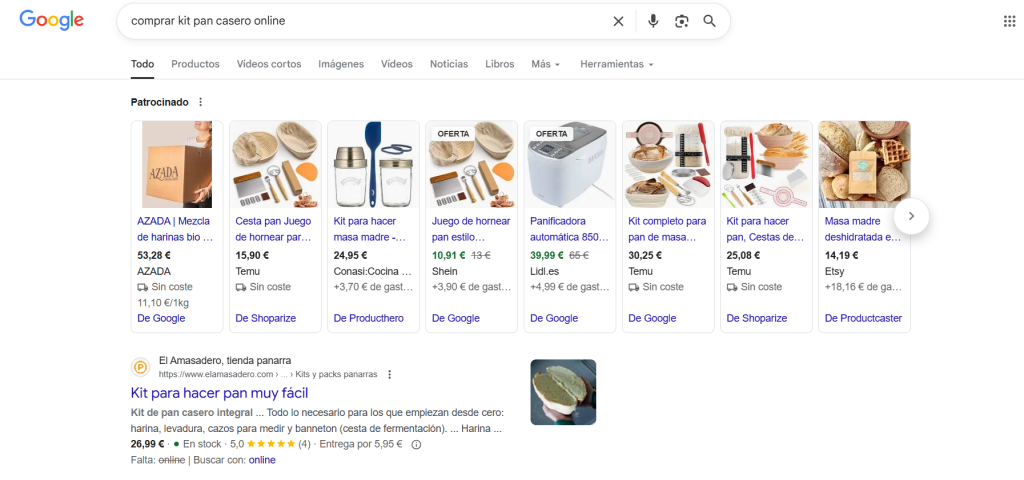 El usuario busca “Mercadona pan casero” o “kit pan casero El Corte Inglés”.