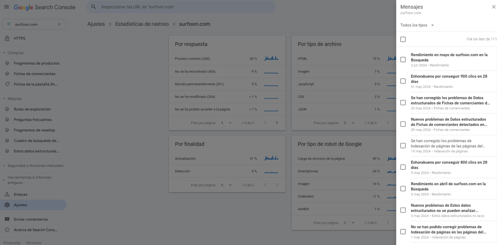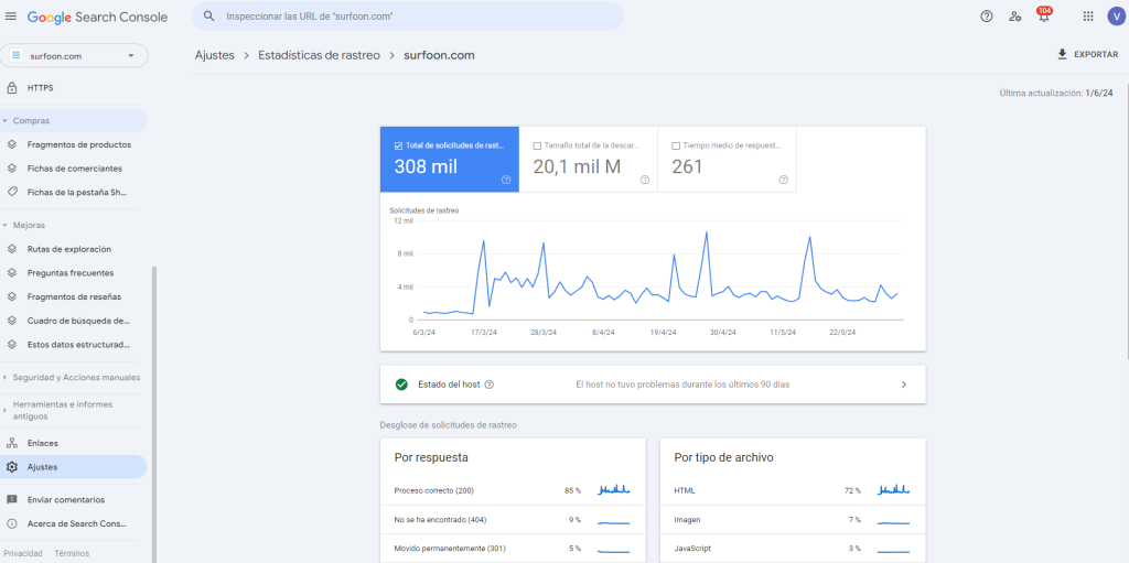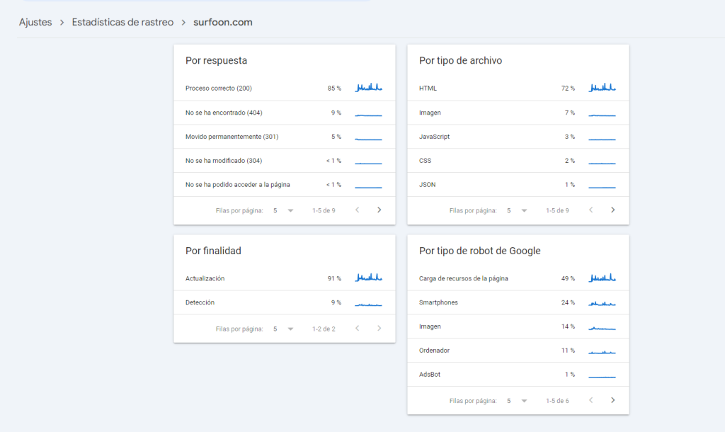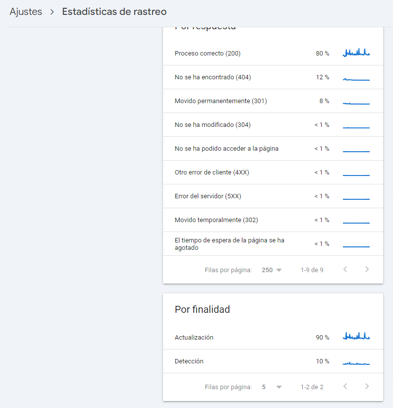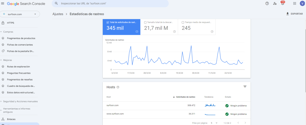 - Estadísticas de rastreo: Bajo la sección «Ajustes» y luego «Estadísticas de rastreo», puedes ver datos sobre la actividad de rastreo de Google en tu sitio, incluyendo:
