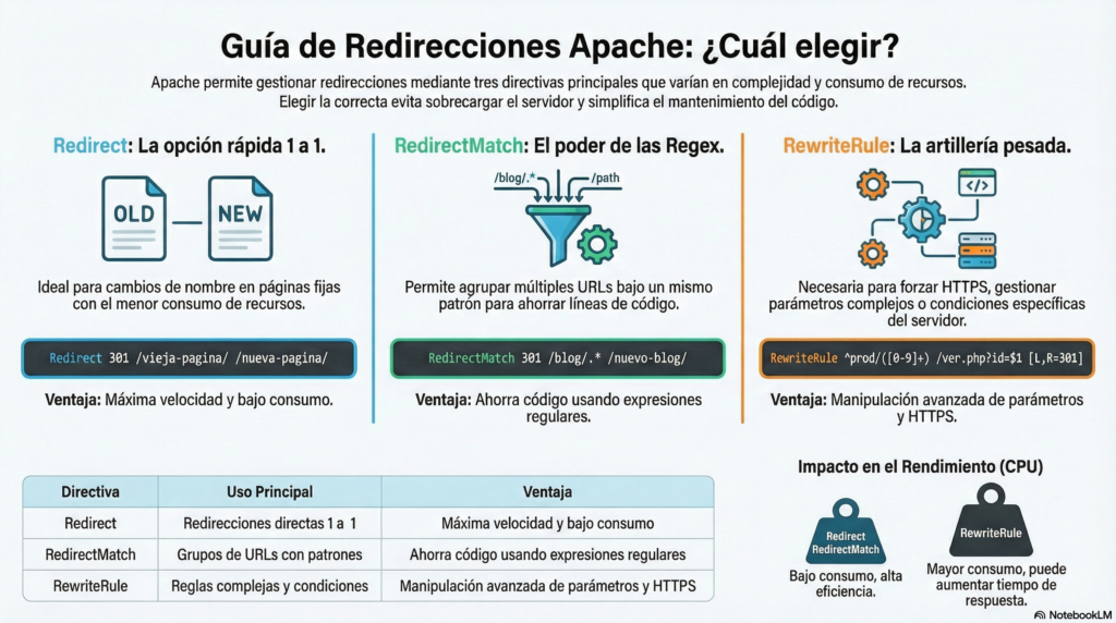 RedirectMatch. - ¿Necesitas lógica (HTTPS, parámetros, condiciones)? Usa