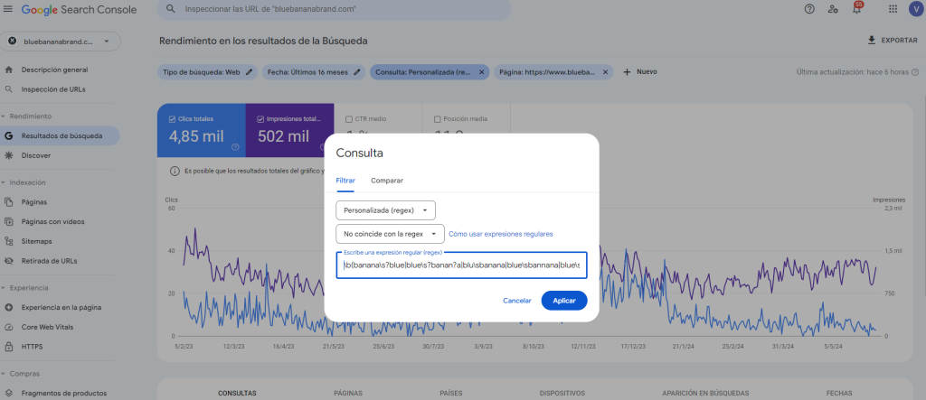 En Google search console, en el apartado consulta selección personalizada (regez) > No coincide con la regex y pega la regex creada con Chatgpt.