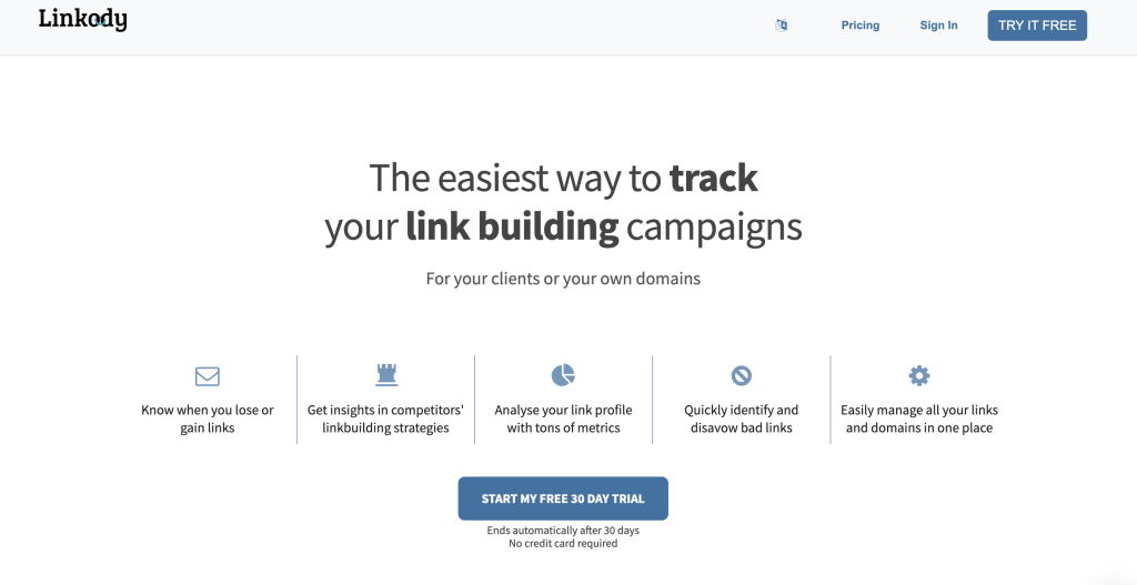 Una herramienta simple pero muy funcional. Linkody monitoriza enlaces entrantes, detecta enlaces rotos o perdidos, muestra métricas como DA/PA y permite generar informes automatizados.