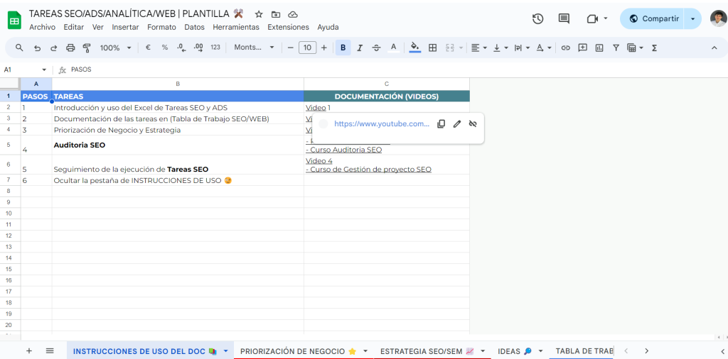Coordinación de todos los cambios a realizar en la web y documentación aterrizada sobre estrategia SEO y priorización de negocio además de la auditoria SEO que realizamos.