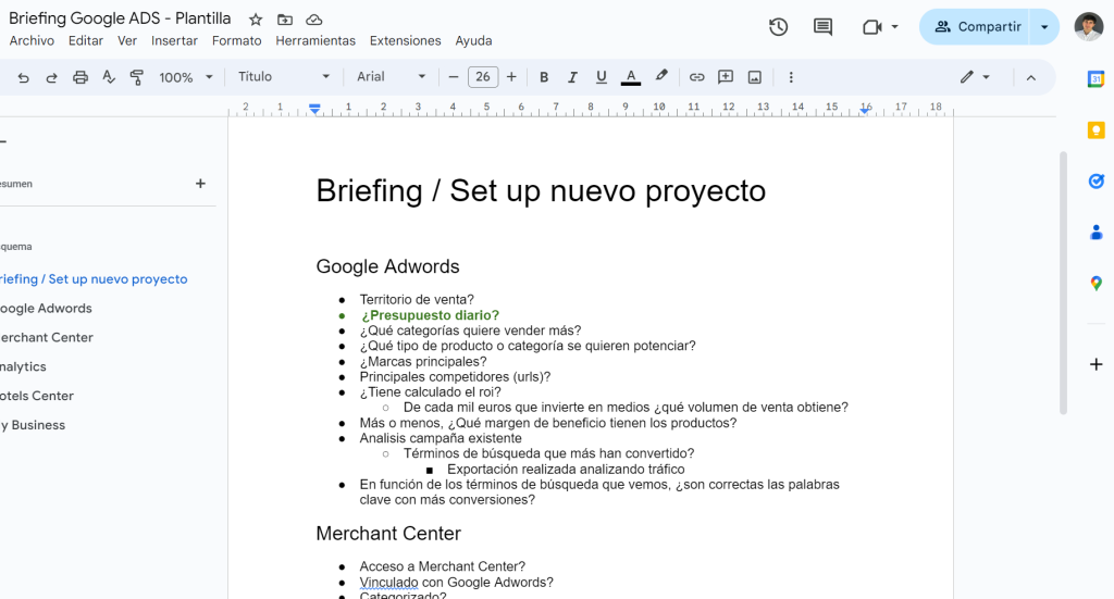 Plantilla de Briefing para hacer preguntas a cliente en la primera reunión de setup.