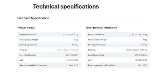 La tabla de especificaciones técnicas es legible (diferentes colores de líneas, estado de desplazamiento de la línea, no demasiado separados)
